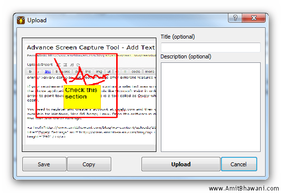 Next you can add lines, arrows, text, crop the selected area or perform similar tasks with the options available following which a small upload window would be shown to you.