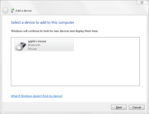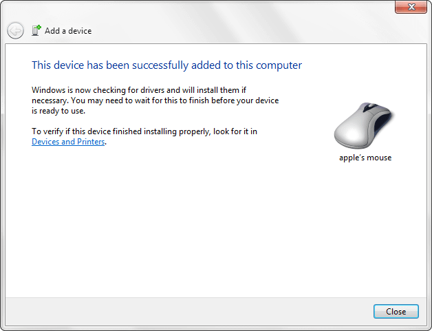 Once the software is installed on your computer you will get a message saying ‘Device Driver Installation Wizard’ > Apple Inc. Apple Wireless Mouse > Ready to Use. Now the device would be visible under the ‘Bluetooth Add a Device Window’.