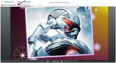 • Now, after the rendering of the facebook album completes, you will be directly be taken to a slide show viewer on Docs which will enable you to see the newly created slide show which you can also edit the presentation or the slideshow which you have created. Now, to open the created slideshow in PowerPoint, click on the PowerPoint Link on the top left of the slide show window and this will prompt you to download the file which you can open the same in Microsoft PowerPoint.