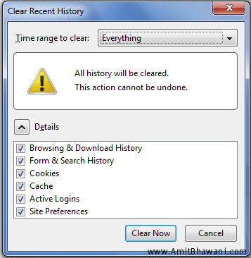 • Firstly head to Menu bar, Tools and just simply select to clear the recent history. In the time range, select option everything and ensure that all options are checked and then click on the Clear now. Now this will erase every single cache which is stored in the Mozilla Firefox including logins and site preferences.