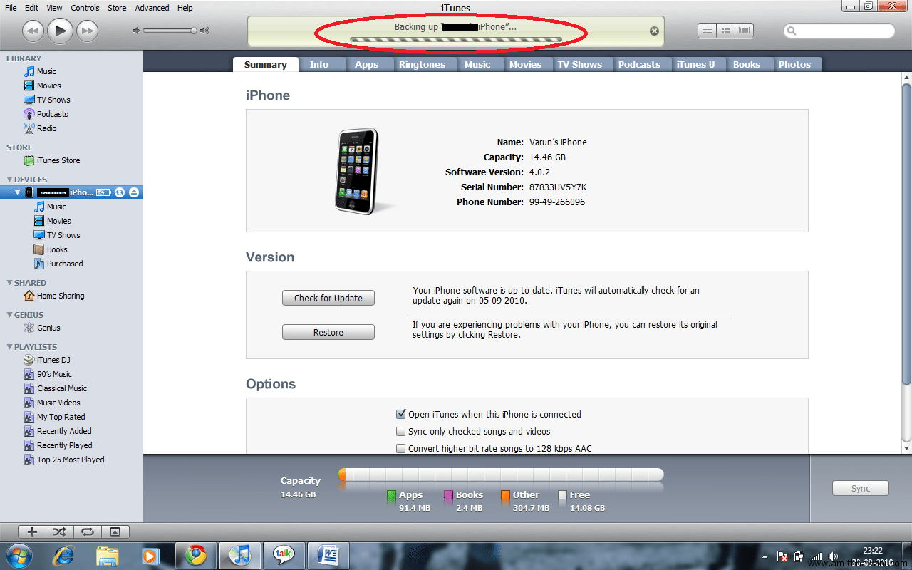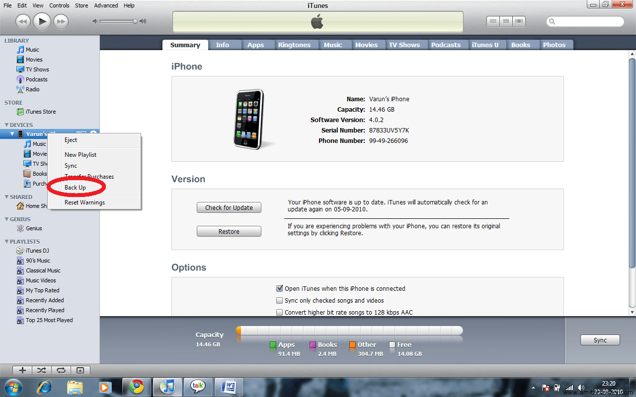 3) After you get these Options you should then Click on the Back Up Option highlighted in the above picture. After you select this Option your iTunes will start backing up your iPhone and all your Contacts, Bookmarks, Photos, Music, videos