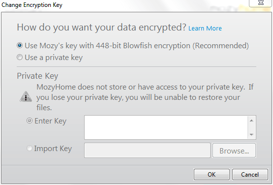 You can click on the link in the above window which says ‘Change Encryption’ to change the type of data encryption from the default 448-bit Blowfish encryption to a Private Key.
