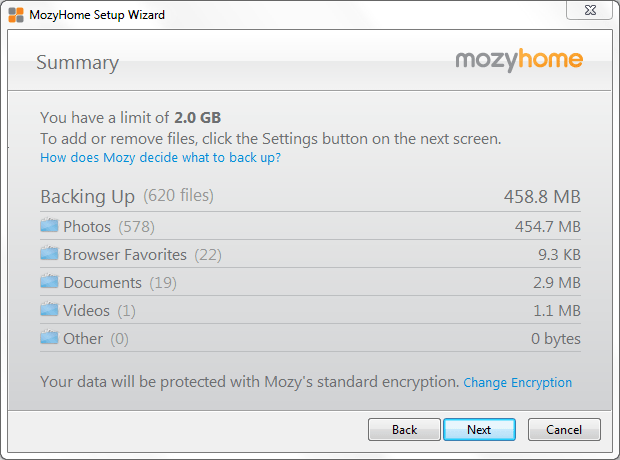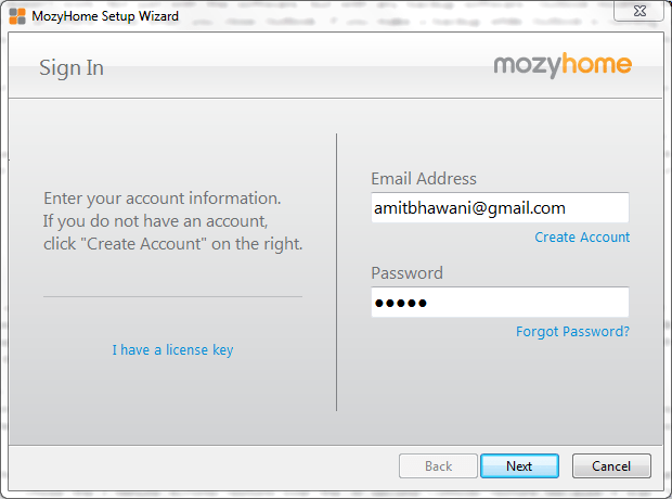 Once you have downloaded the software application and installed it, you will be shown with a window which says ‘MozyHome Setup Wizard’ and ask you to enter your account logins to get started as shown below.