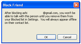 Following this you will be shown with a small Dialog Box which is a final confirmation to Block your friend instantly after which you wont be able to send or receive messages from him/her.