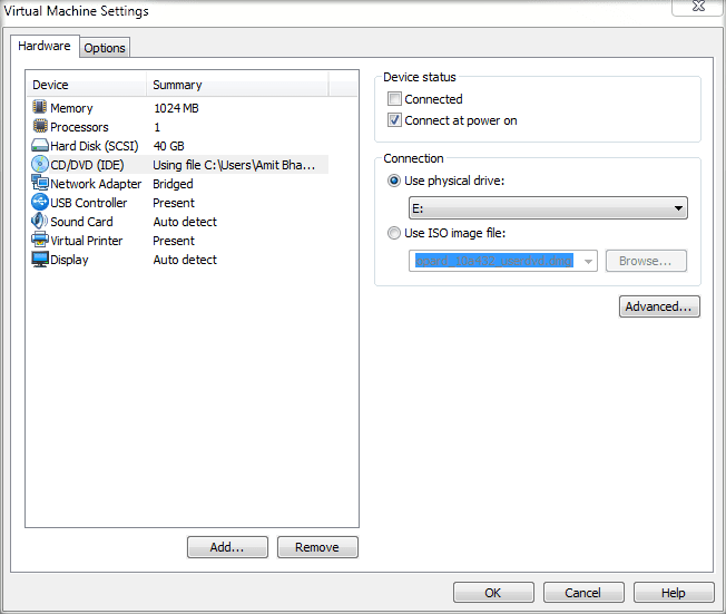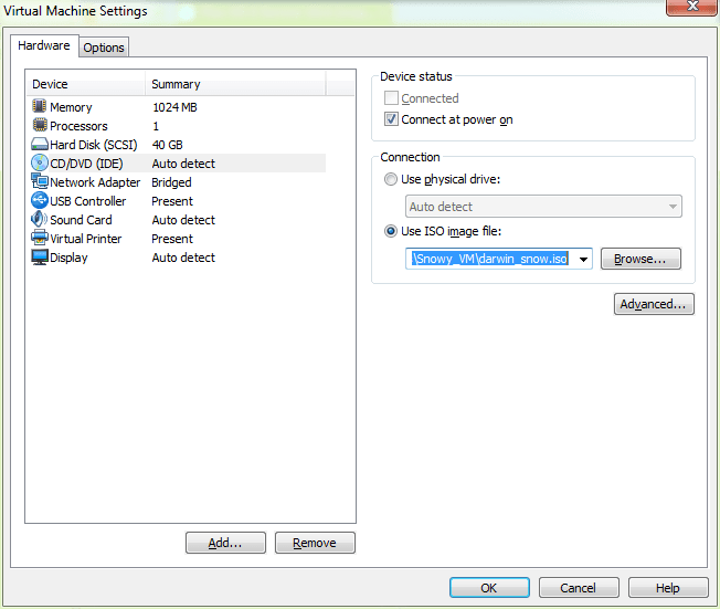Next you can configure the Devices option using the ‘Edit Virtual Machine Settings’ which will allow you to Increase or Decrease the Memory Size, Hard Disk Space, Processors, CD/DVD Drive, Display etc. Generally its recommended to increase the RAM size if its possible because that way you can run both the Operating Systems with better performance. Next under the CD/DVD Edit option you need to select the downloaded ISO file[Darwin_Snow.iso] instead of the ‘Auto detect’ option.