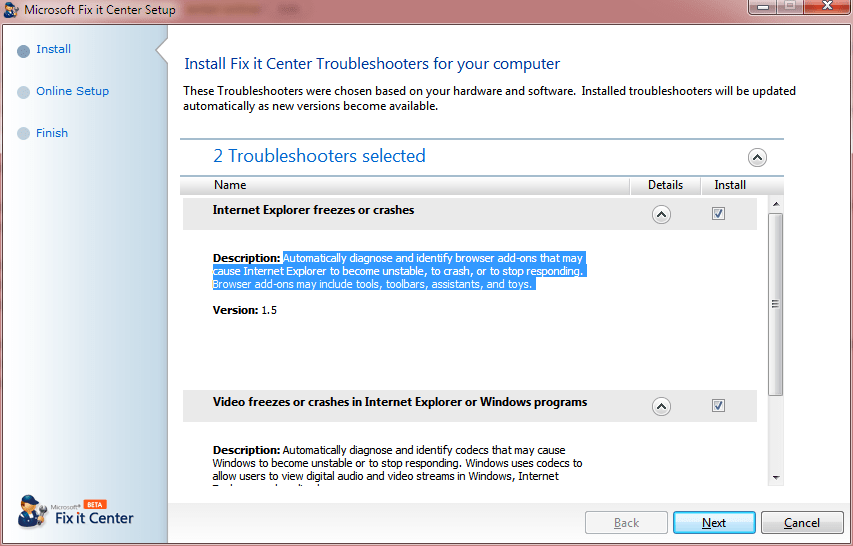 Next, once the whole software download is completed, you will find that the software will scan your computer by Gathering Information about your computer and give you a list of all the problems as shown below. In my case it gave a report with two TroubleShooters selected which would mainly fix the Internet Explorer Problems which freezes & crashes the browser.