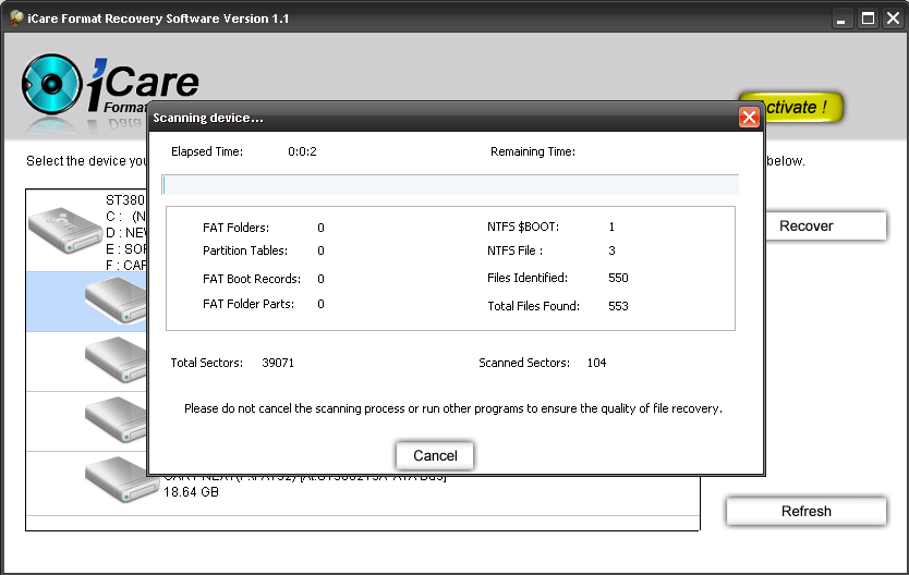 The use of iCare Format Recovery is very easy and the whole software itself consists of not more than 20 click functions options. Select the device and go.