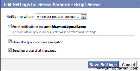 On the right side top of the group there is a button which says – Edit Settings, click on this and a small window would be shown to you. Here there are different notifications options listed where you need to ‘uncheck’ on the ‘Email notifications to:’ and then click on the save settings button. This would ensure that you don’t get any email when a member either posts or comments in the group.